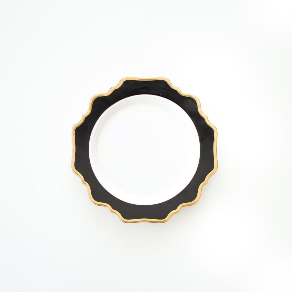 - (2) Dinner Plates: (10.5”) White and black porcelain with hand painted gold rim