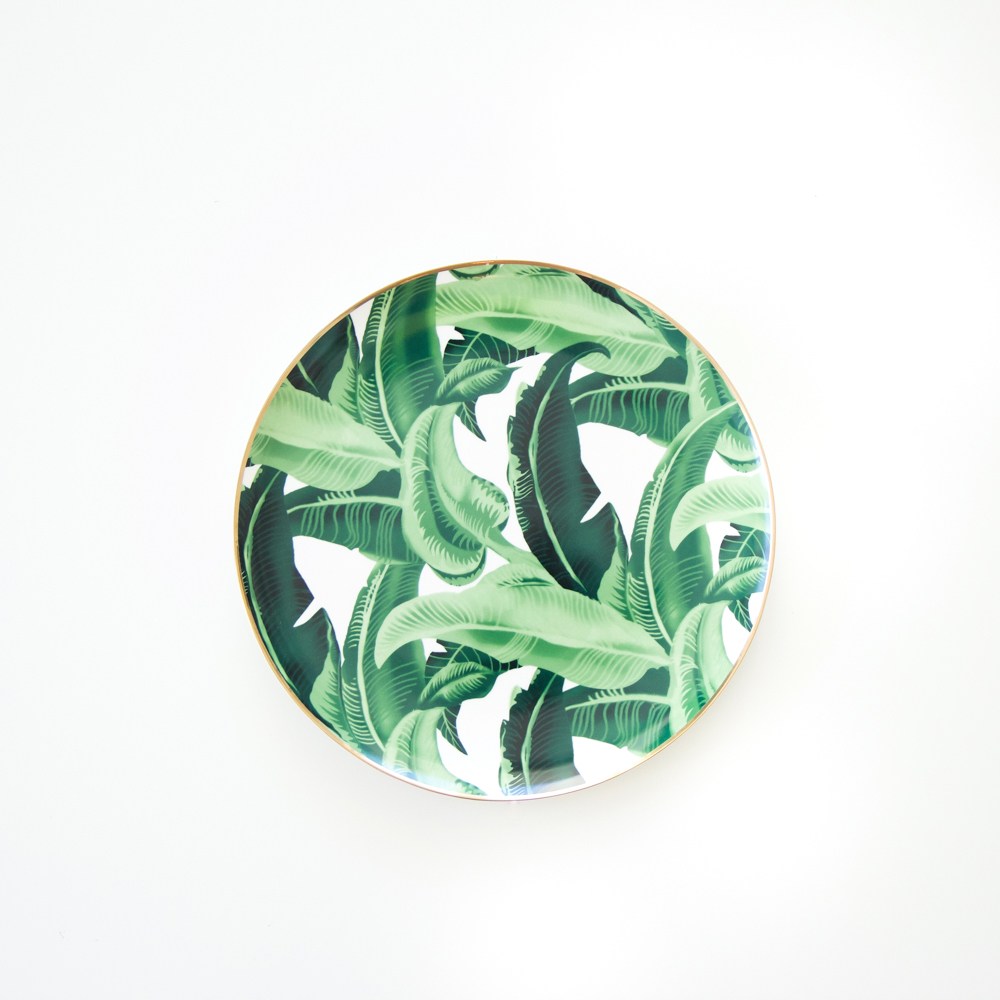 - (2) Banana leaf Charger Plates: (12”) White bone china with gold rim. Palm leaves charger plate.